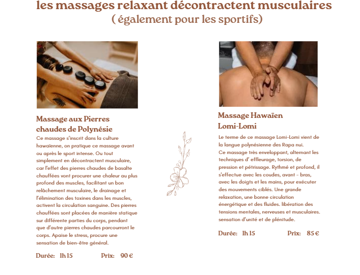 Les horaires de rendez-vous sont respectés et Madame Atienza Francesca se réserve le droit en cas de retard de plus de 15 minutes de refuser d’exécuter la prestation afin de ne pas perturber son planning. La durée de la prestation pourra être imputée du retard.